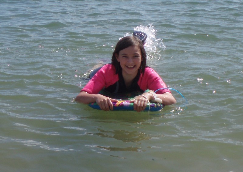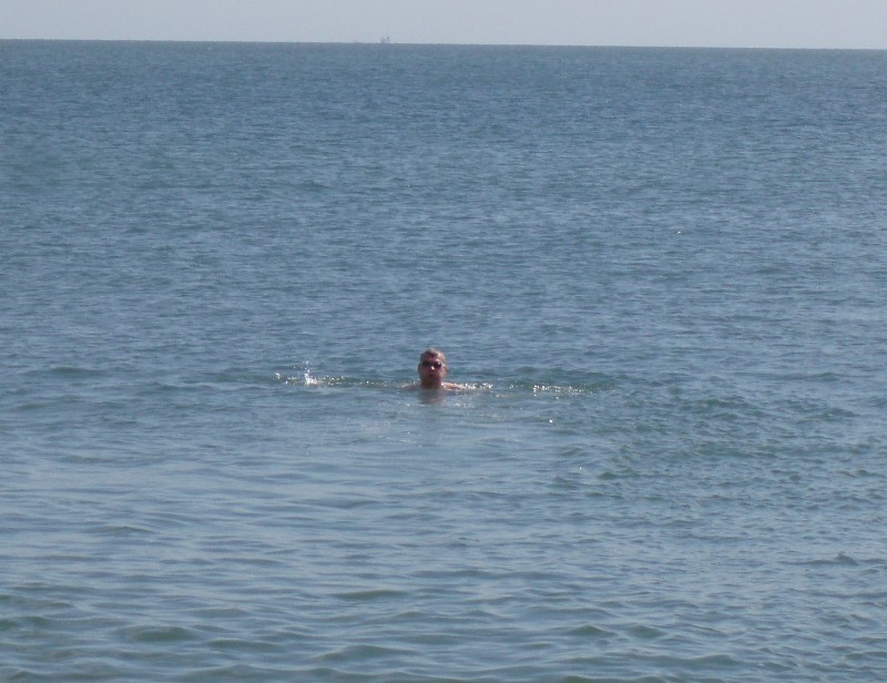The sun was shining, and so, it was straight to the beach to get the best of the weather. No sooner had we parked up at Southwold, than Ellie was in her wetsuit and in the water. The sun was shining and sparkling off the water, which seemed to eb speaking to me, saying …’swim in me’… and so I obliged. Trunks on and goggles on, and a march into the sea, and a dive forward… the water was a little sharp in the temperature but not too bad, and so I spent a pleasant half hour in the sea with Ellie. Ellie stayed in for ages, until she got a small jellyfish on her arm, and a little sting. Here is Ellie on her board, and me out at sea