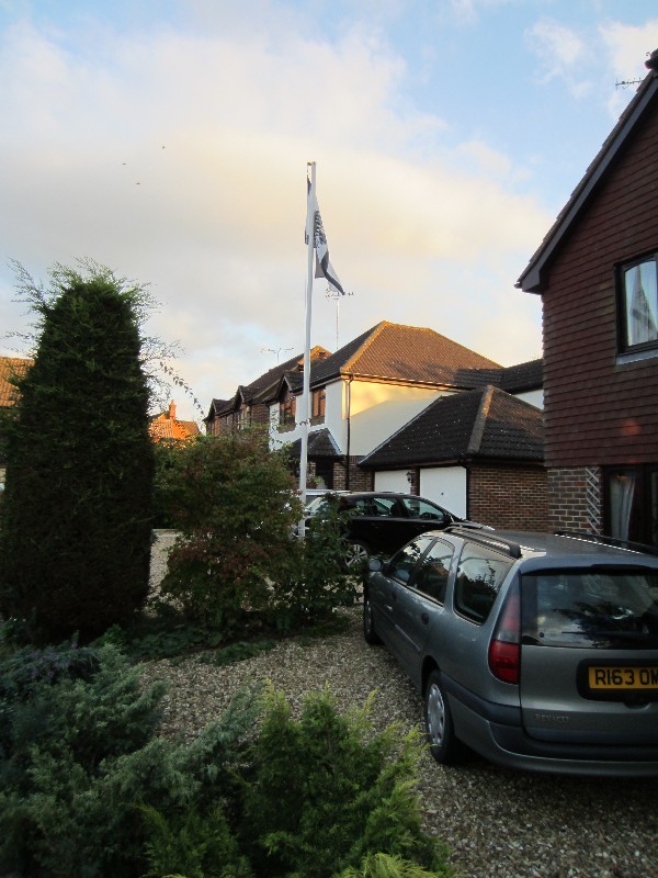 I took Robbie back to Northampton (or Prussian HQ as he calls it) on Sunday evening, and so replaced the Pussian flag with an English cross of St George flag. I had wanted to fly a Union Jack this last Friday as it was Trafalgar Day, but didn’t have one till I managed to buy one yesterday. So today I put the Union Jack up.