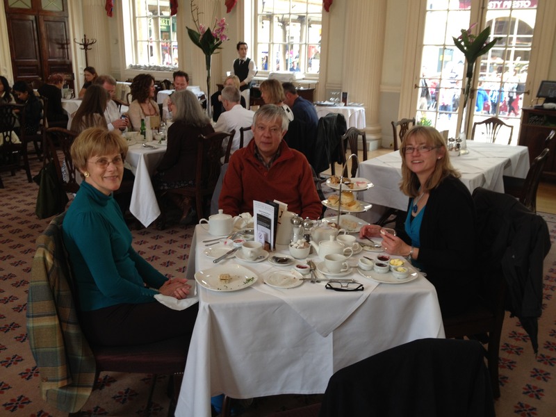 After the Abbey, and a little wander taking in the atmosphere of Bath, we went for tea at the Pump Rooms. Tricia had booked us a table some time back. Trouble was, even after a light lunch, we weren’t particularly hungry…. but you know how it is when beautiful sandwiches, scones and cakes are on offer… you force yourself! Here we are, and also a picture of me trapping Pat in the revolving doors.