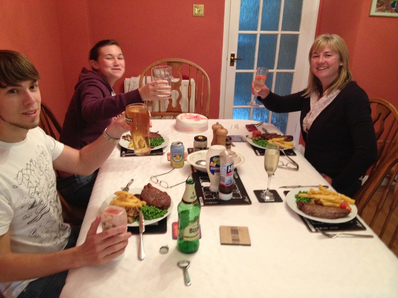 Strewth. How many cards did we have to write! I got Tricia a new backpack / rucksack, and a ‘walking’ shirt for her birthday, items she wanted for the walk she is doing next month with Robbie. The kids got Tricia some plants Tricia wanted for the garden. She had loads of little gifts from friends, and cards… and last Thursday got taken to the theatre by her friends. So she did well. On her birthday she chose to spend the day at an athletics track, cheering on her athletes and giving coaching advice. In the evening we sat down to ‘steak and chips’ (what else – and the steak we got from the local butchers was glorious)… and bubbly. Nikki was away over the weekend, part training at Bath, and part partying with her friends (she has just arrived back home looking very weary), but with Robbie she made a cake for Tricia… the lily is Robbies work.