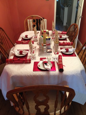 Tricia, Nikki, Ellie and myself all went up to midnight mass. Back home, Santa came, and then he went to bed…. knackered. Christmas morning the house came alive around 8am…. we had stockings opened first, then after breakfast, the presents under the tree, as we always do. Dinner was late, as the fan in the oven seemed to be going and we discovered the Turkey not cooking quite as quickly as expected. We got there in the end, and had Christmas dinner about 3:30. By the time we had tidied everything away it was then close to 5pm… all that work for one day and it was gone in a flash. We sat and watched a Batman film Robbie had got in his stocking, and then gradually we wll took to our beds around 10pm. The kids seemed happy with their pressies, Ellie had tickets to go and see Olly Murs in March, and a new coat she wanted, Nikki had a portable physio bench, and Rob had a nice new camera, which he has had fun experimenting with. I got Tricia an ice cream maker (its what she asked for!) and a new cycling jacket. Tricia got me some tickets to go and see Caro Emerald in March which I am looking forward to already. One night she will be taking Ellie to the O2 arena for Olly Murs, and then next night she will be at the Royal Albert Hall with me for the Caro Emerald concert. She will be tired ! Here are some piccies of the day. First one was taken by Rob on his new camera, with the timer. Then one of the berakfast table set.