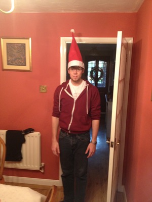 Nikki cutting some ribbons for table decorations and Robbie with his Xmas hat on…