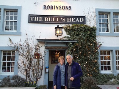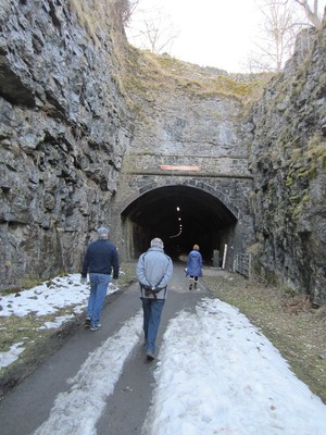It was then back to the B&B, 10 minutes for ‘comfort breaks’ and we were then off again. The B&B overlooked a lovely valley (Cressbrook Dale) and we went off to explore. Across the river, we then walked up to an old railway line, which is now used for cycling and walking, and known as the Monsal trail. We walked through two tunnels on what was the Buxton to Bakewell line, before coming out by (above) Litton mill. We descended the side of the hill, back over the river, and then alongside the river gradually back to the B&B. Probably abvout 3 miles, perhaps more, but the weather was lovely, as was the walk. The tunnels were great, snow had drifted quite a way in, and there was some interesting icicles formed along the tunnel wall. Coming back along the river we had plenty of sun. Back in the B&B it was a glass of bubbly, before going to the Bulls Head at Ashford-in-the-Water. A country pub, very friendly, and brilliant well priced food. We enjoyed our meal so much, we booked in for the Sunday evening as well. All the walking and fresh air took its toll, as we were all back in the B&B and in bed by 10.