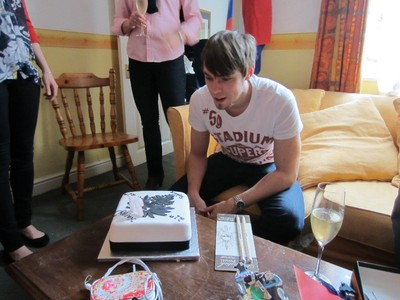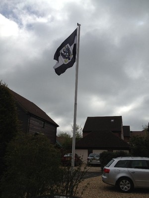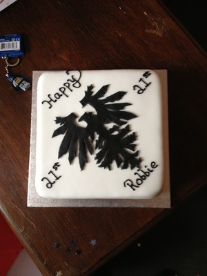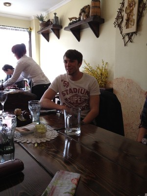 Sunday was Robbies 21st… a landmark date many years ago. These days 18 is the new 21, but nonetheless it still gets celebrated. At about 6:50am Robbie turned 21. We flew the Western Prussian flag for Robbie at home. Then Tricia, Ellie and myself set off to Northampton to see him. We went to a Polish restaurant with Robbie and his two uni friends, Jordan and Veronika. I have to say I particularly liked the beetroot soup…. after lunch we went back to Rob’s house for cake, some champagne, cards etc. A few pics… First off, the flag flying, then a picture of Robbies cake – which of course has a Prussian eagle on it – and then Rob himself in the restaurant.