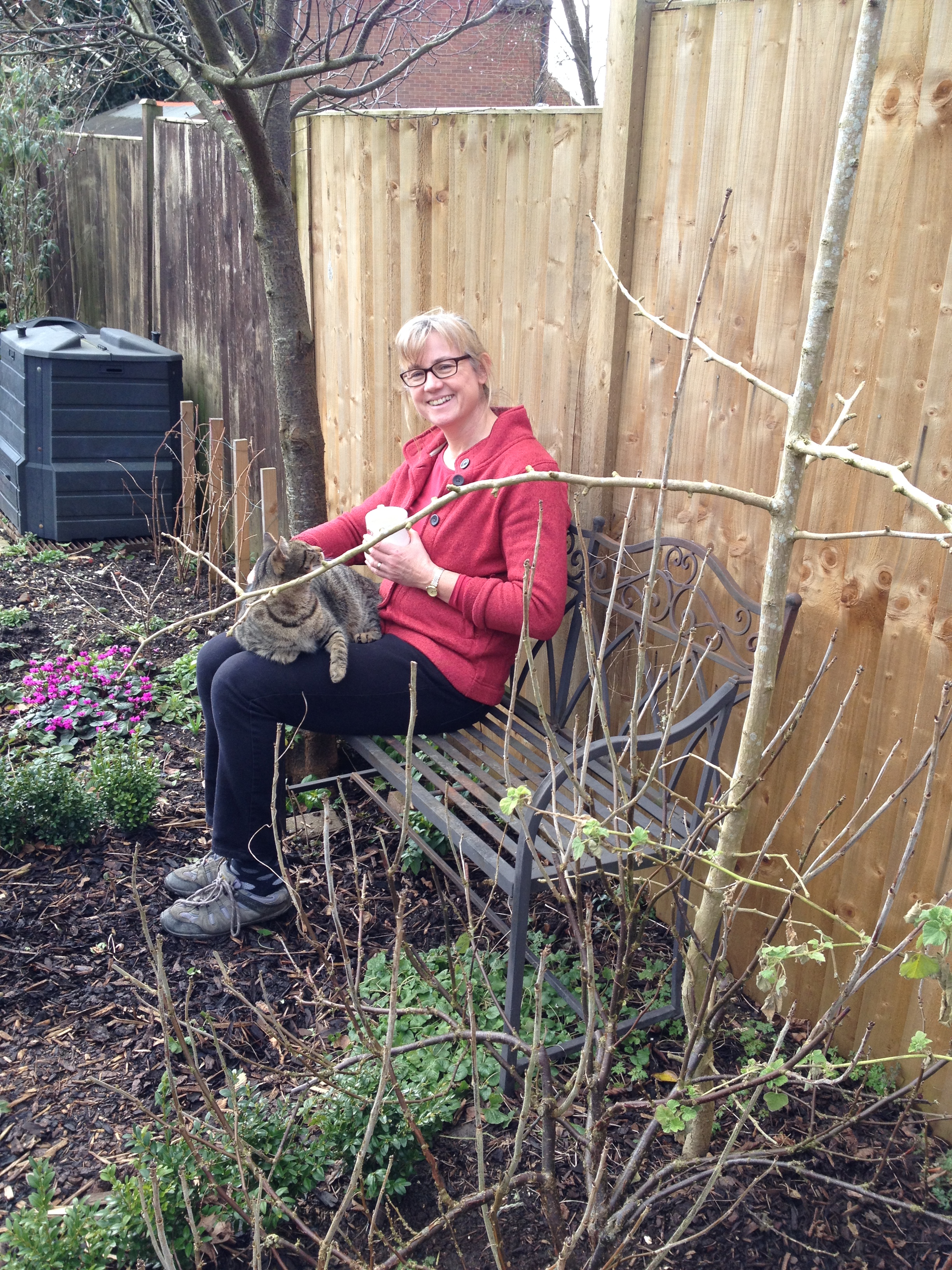 Yesterday, I took Ellie to the gym, whilst Tricia and Nikki went off to Newbury to play Hockey… Nikki enjoyed her game, but Tricia said that would be her last. We will see! Robbie made a shield and had a driving lesson. He is pleased with his progress. A quiet day today, Ellie and I went to the gym, Tricia went to church and then when I came back I cooked lunch – a standard Sunday roast. Nikki and Tricia went off on a ‘Lent walk’ this afternoon… I struggled to stay awake in the chair :-). Here is Nikki having a break… Tricia took Basil, and Nikki to Mack. It’s great to borrow dogs and give them back afterwards :-). Also a picture of Tricia enjoying a cup of tea outside for the first time this year, along with the obligatory cat on her lap… and Robbie, playing a new game he has called Attila. As you can see he is dressed for the occasion. He sat and ate his evening meal dressed like it…. don’t ask me to explain….